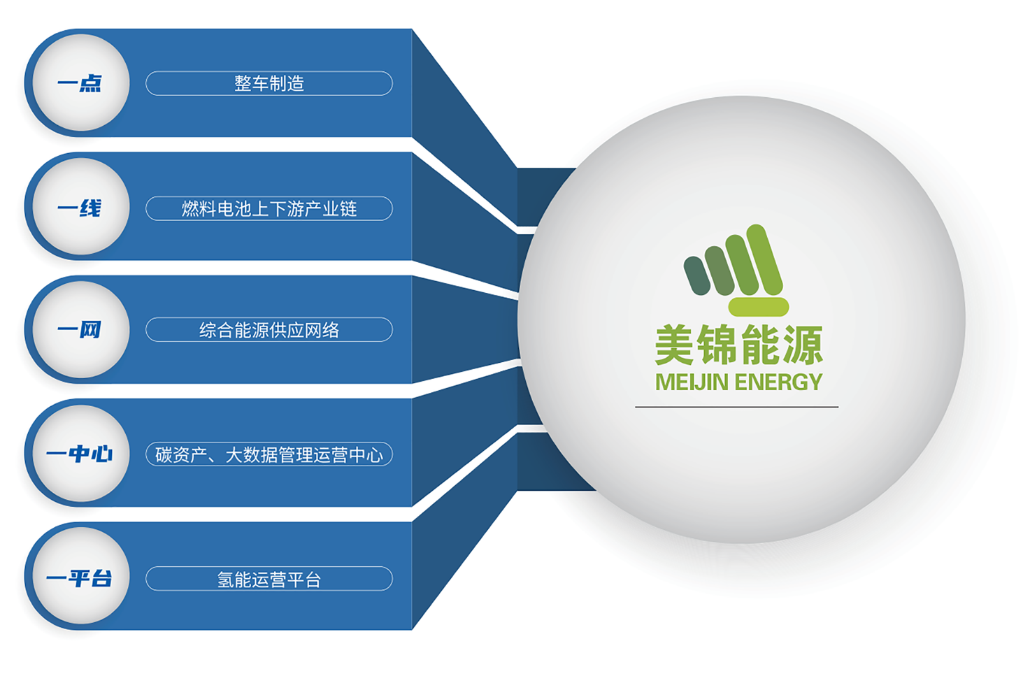 美锦能源氢能产业发展全面推行“五个一”战略:“一点(整车制造)、一线(燃料电池上下游产业链)、一网(综合能源供应网络)、一平台(碳资产、大数据管理运营平台)、一中心(氢能汽车运营中心)”。